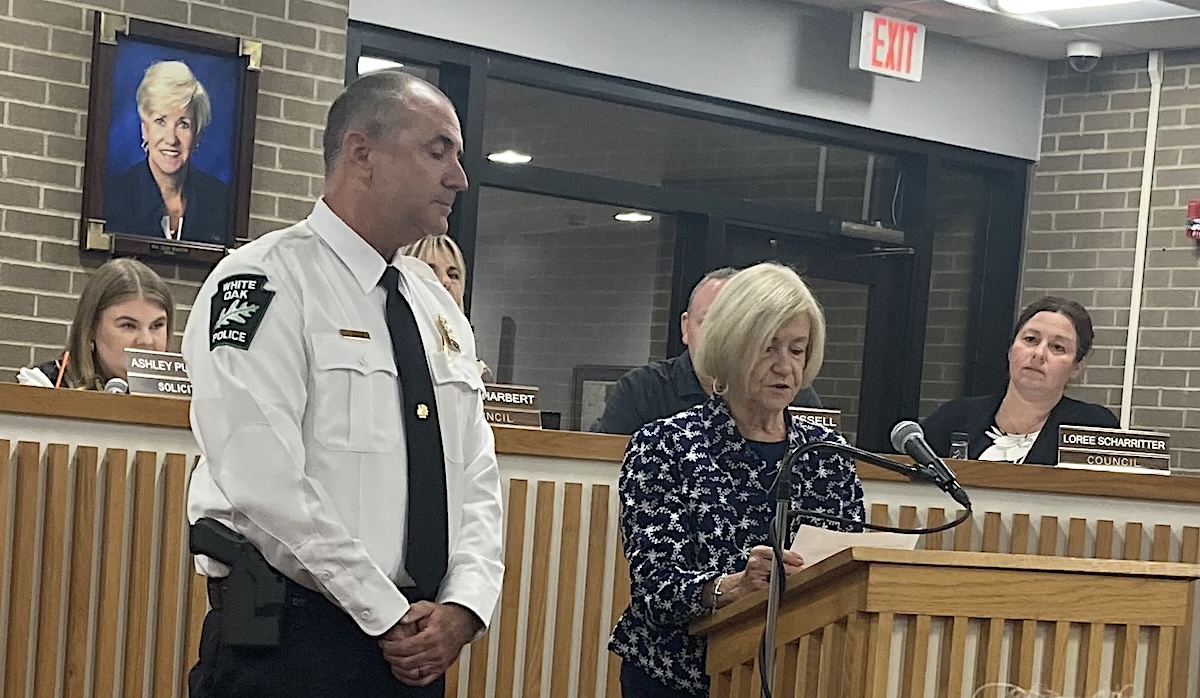 White Oak Mayor Ina Jean Marton (at podium) introduces new White Oak Chief of Police Jason Binder at the September borough council meeting. (T.J. Martin photo for Tube City Almanac)