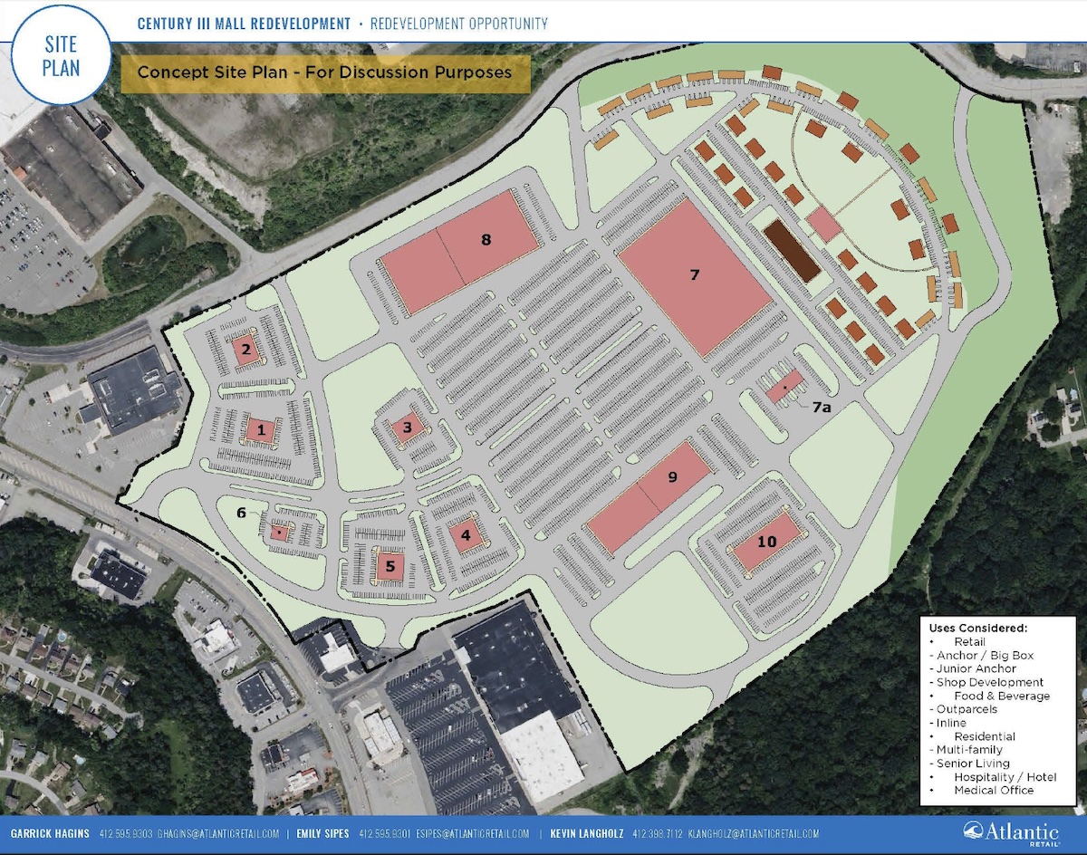 A developer is interested in the former Century III Mall site and has presented a possible development scenario. Zappala said there are currently no red flags raised by the developer or his plan, but that officials will work to hold the property owners accountable to the community. (Image courtesy Allegheny County District Attorney Stephen Zappala Jr.)